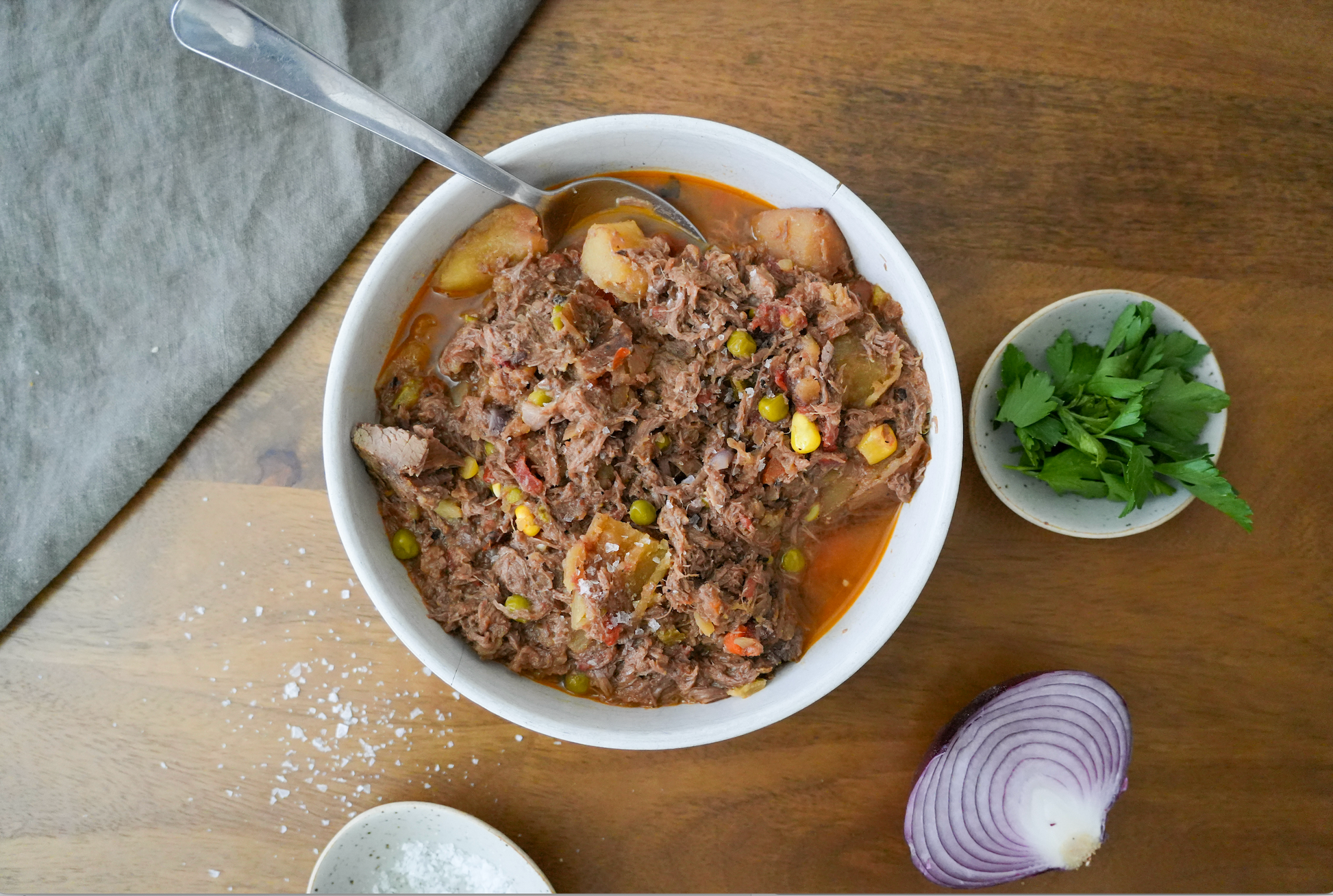 - Pulled Beef, Barley, Carrot, Celery, Peas, Corn, Onion, Bay Leaf, Peppercorn